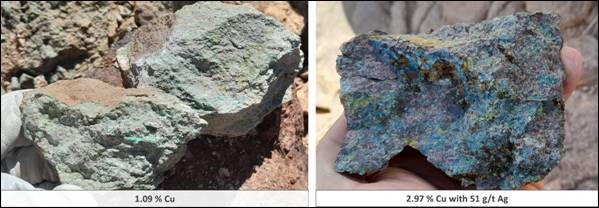 - Encouraging copper and silver grades returned from early-stage surface sampling, including: