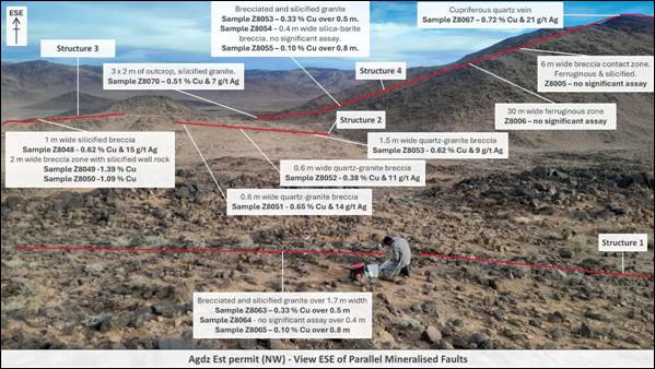 These results support the interpretation that Agdz Est forms part of a broader, district-scale copper-silver system, with multiple mineralised structures developed within a favourable geological setting.
