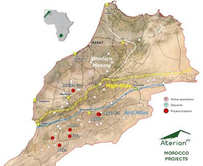 Aterian has a portfolio of multiple copper-silver (+ gold) and base metal projects in Morocco. Aterian holds a 90% interest in Atlantis Metals, a private Botswana-registered company holding eleven mineral prospecting licences for copper-silver in the world-renowned Kalahari Copperbelt and three for lithium and salt brine exploration in the Makgadikgadi Pans region. The Company also holds an exploration licence in southern Rwanda, where it is evaluating the tantalum and niobium opportunity, in addition to further exploring for pegmatite-hosted lithium.